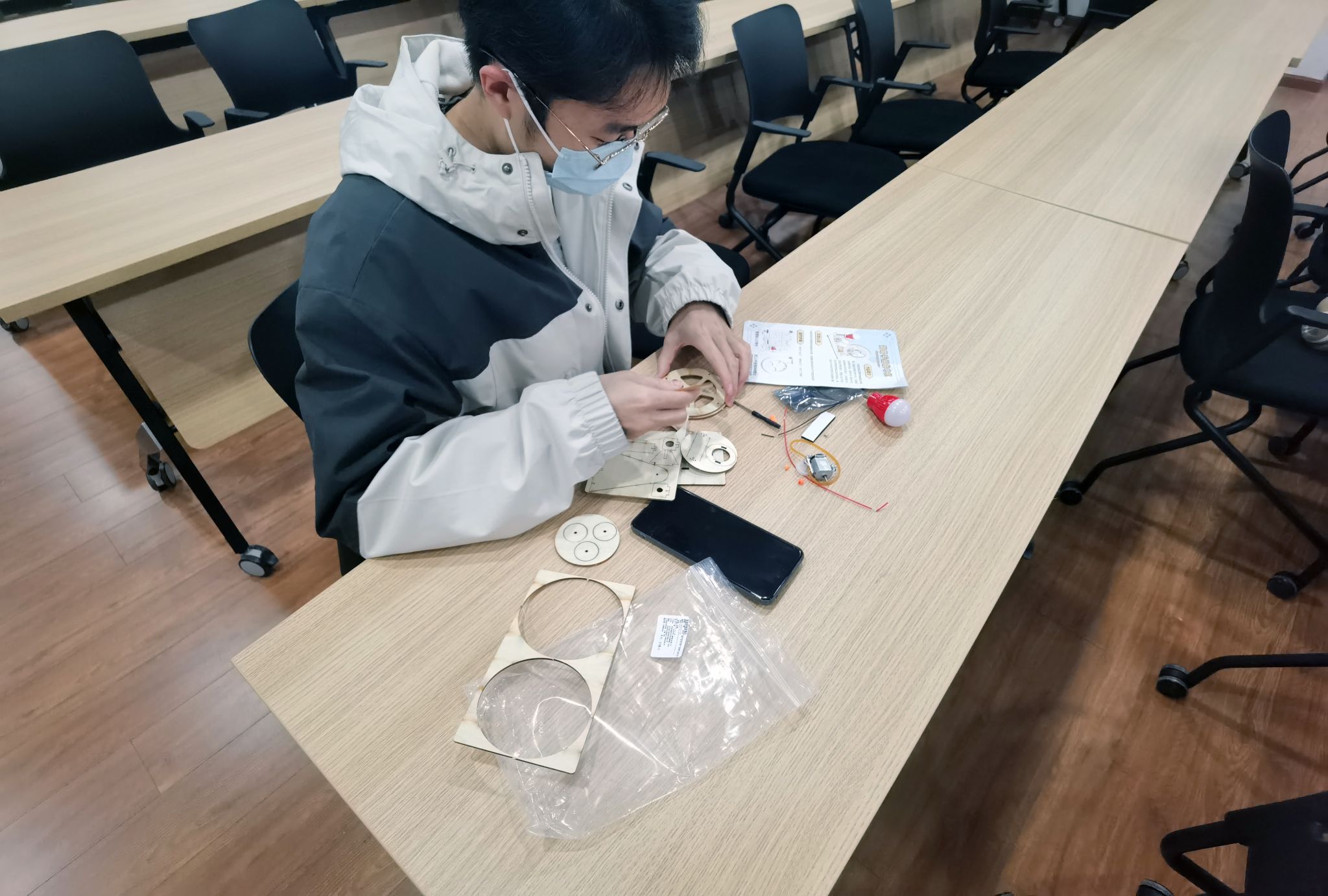 随后,趣味竞赛正式拉开帷幕。各小组领取塑料转轴、漆包线、LED灯等简易材料,对照简化电路图分工协作。绕制线圈、连接电路……党员们凝神聚力、互相配合,在限定时间内完成手摇发电机模型的搭建。