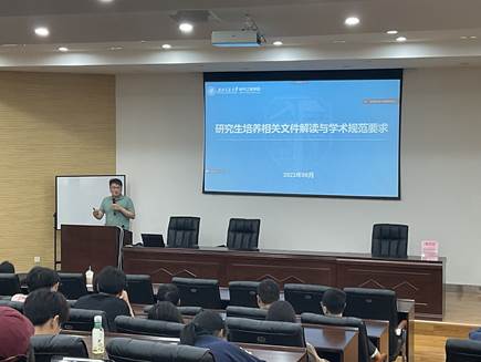 为打造“精勤研途”,传承“双严”传统,助力研究生2023级新生合理开展学业规划,学院恪守科学精神、坚守学术诚信系列教育活动于9月26日15:00在九里校区J0222开展研究生培养相关文件解读与学术规范要求讲座,副院长刘志刚教授主讲。
