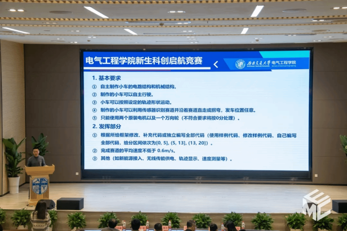 会上发布了新生科创启航竞赛赛题《寻迹小车》。熊成林老师深入讲解了该赛题的基本要求、评分细则和技术要点,他鼓励同学们通过自主制作电路和机械结构,编写控制算法,在实践中提升工程能力,从小白蜕变为科创高手。