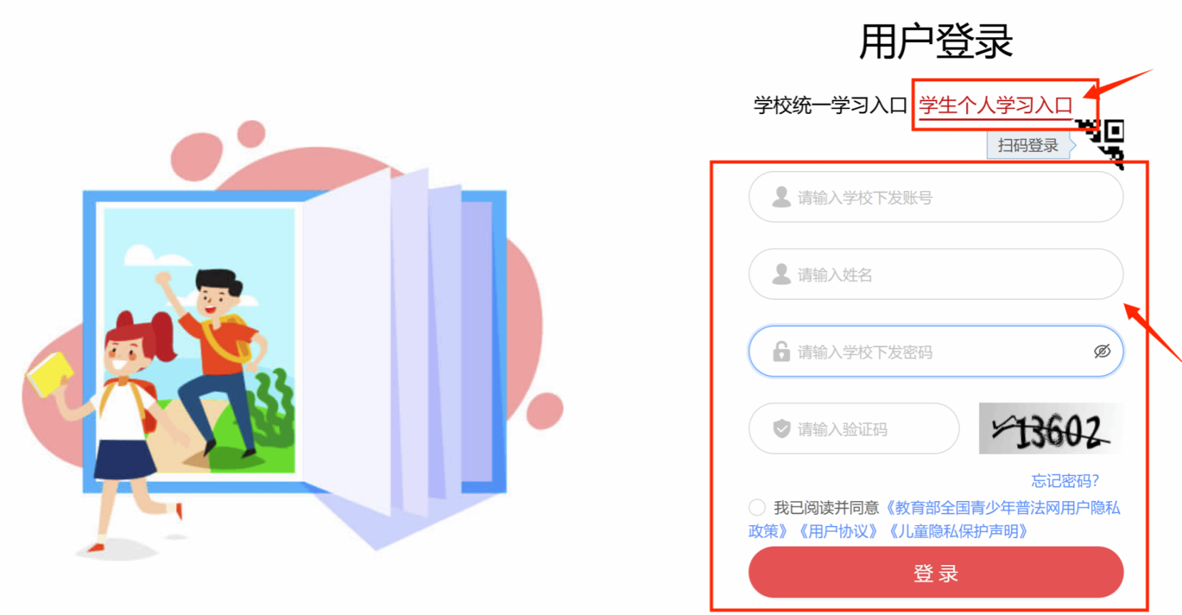 搜索教育部全国⻘少年普法⽹-点击“宪法活动”-点击右上⻆“登录”;或直接点击以下链接登录https://qspfw.moe.gov.cn/index.html(各年级用户名及初始密码均已交给年级辅导员,后续将通过相应渠道分发给同学们),通过学生个人学习入口登录,开始学习。