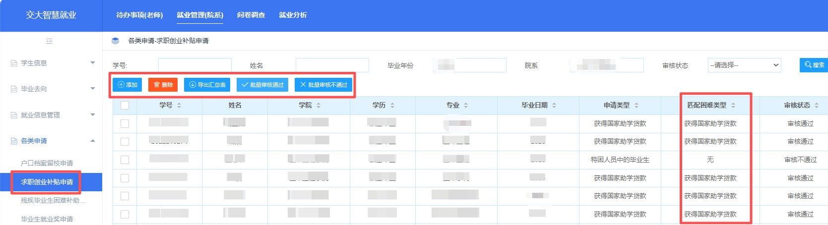 2.核对申请求职补贴的学生名单,并在智慧就业网导出《xx学院符合补贴要求无需提供证明材料学生明细表》(附件3)和《xx学院符合补贴要求需要提供证明材料学生明细表》(附件4),填写《569vip威尼斯游戏求职补贴申请汇总表》(附件5)。